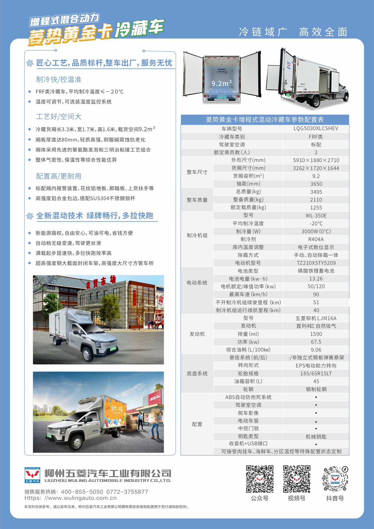 菱势黄金卡冷藏车,全新一代增程式混合动力,起步快,旋钮式换挡,驾驶丝滑 。 FRF类冷藏车、平均制冷温度≤-20℃,制冷快,控温准。 冷藏货厢长3.3米,宽1.7米,高1.6米,载货空间9.2m³。 冷链物流全能型选手,抢单不犹豫!