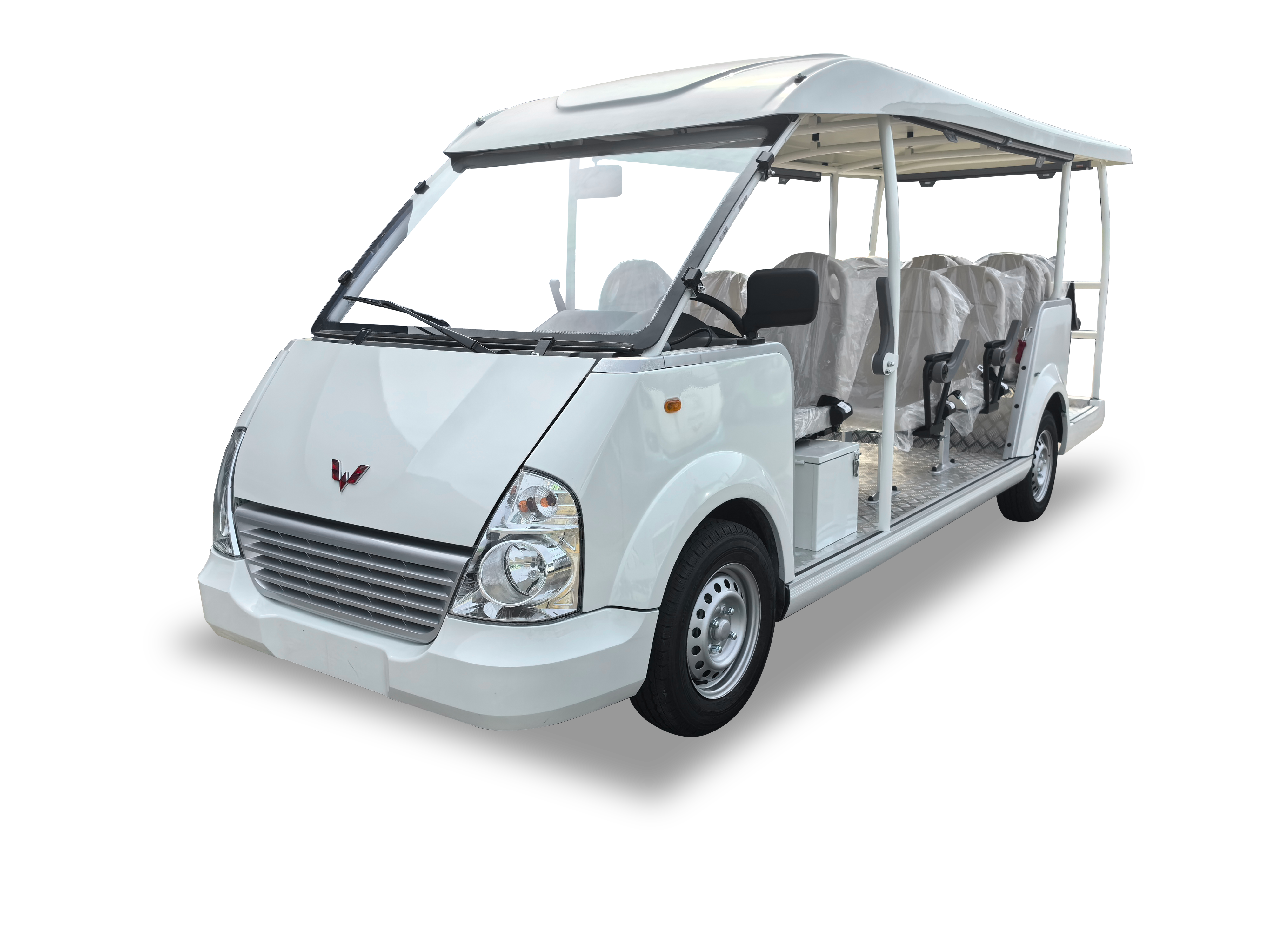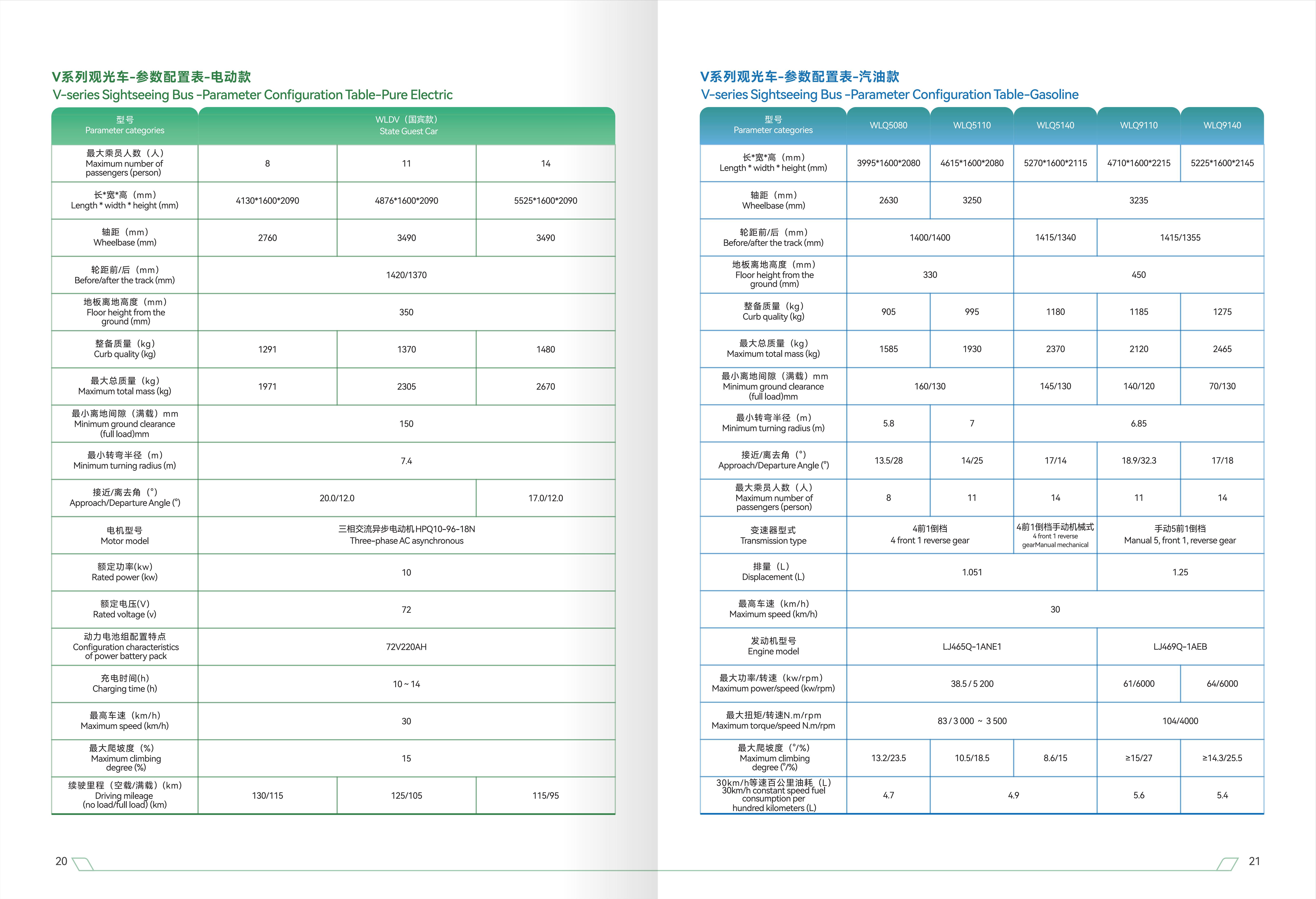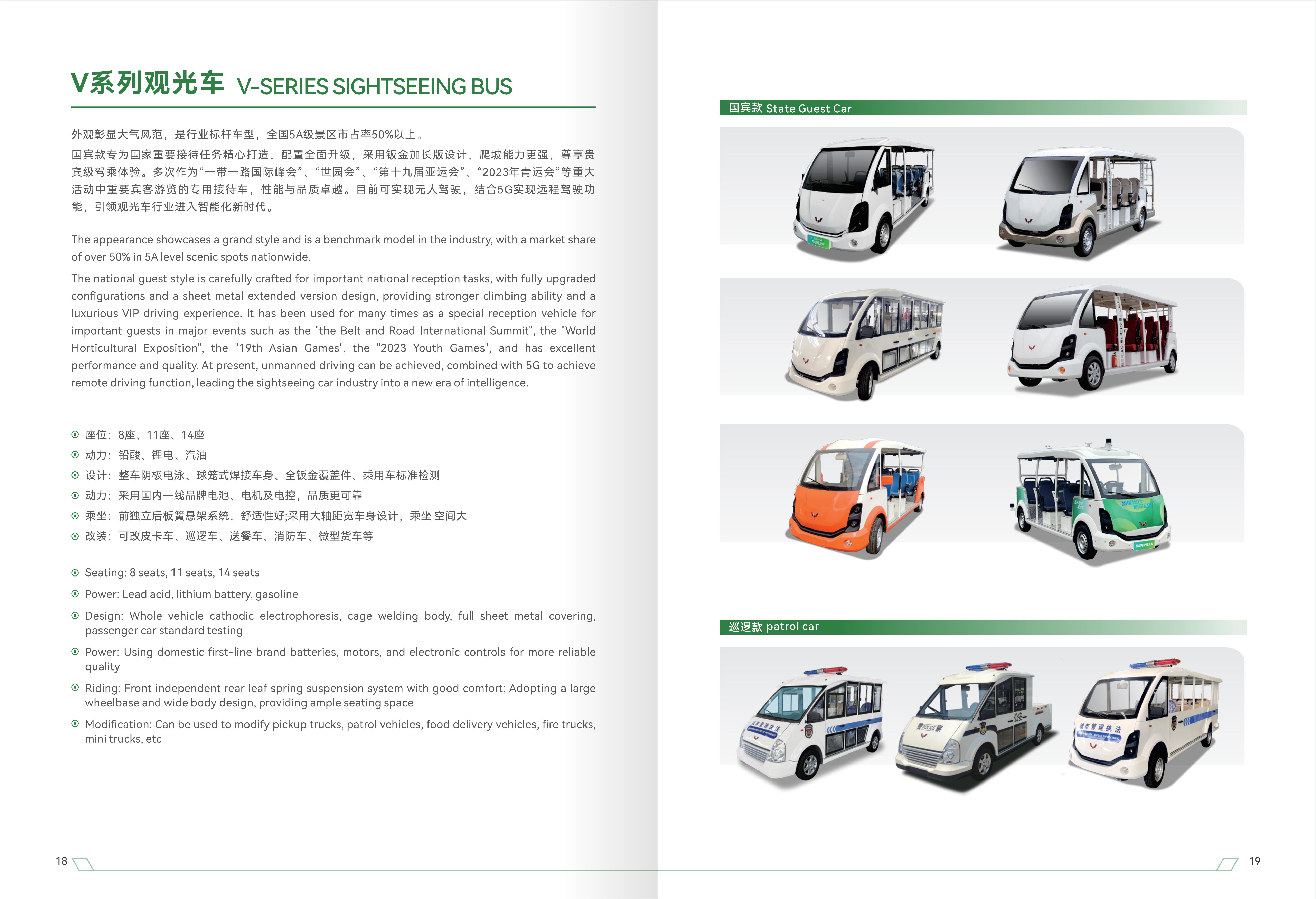 座位:8座、11座、14座 动力:铅酸、锂电、汽油 设计:前伸式车头设计、整车阴极电泳、球笼式焊接车身、全钣金覆盖件、采用乘用车标准检测 动力:采用国内一线品牌电池、电机及电控,品质更可靠 乘坐:前独立后板簧悬架系统,舒过性好;采用大轴距宽车身设计,乘坐空间大 改装:可改皮卡车、巡逻车、送餐车、消防车、微型货车等