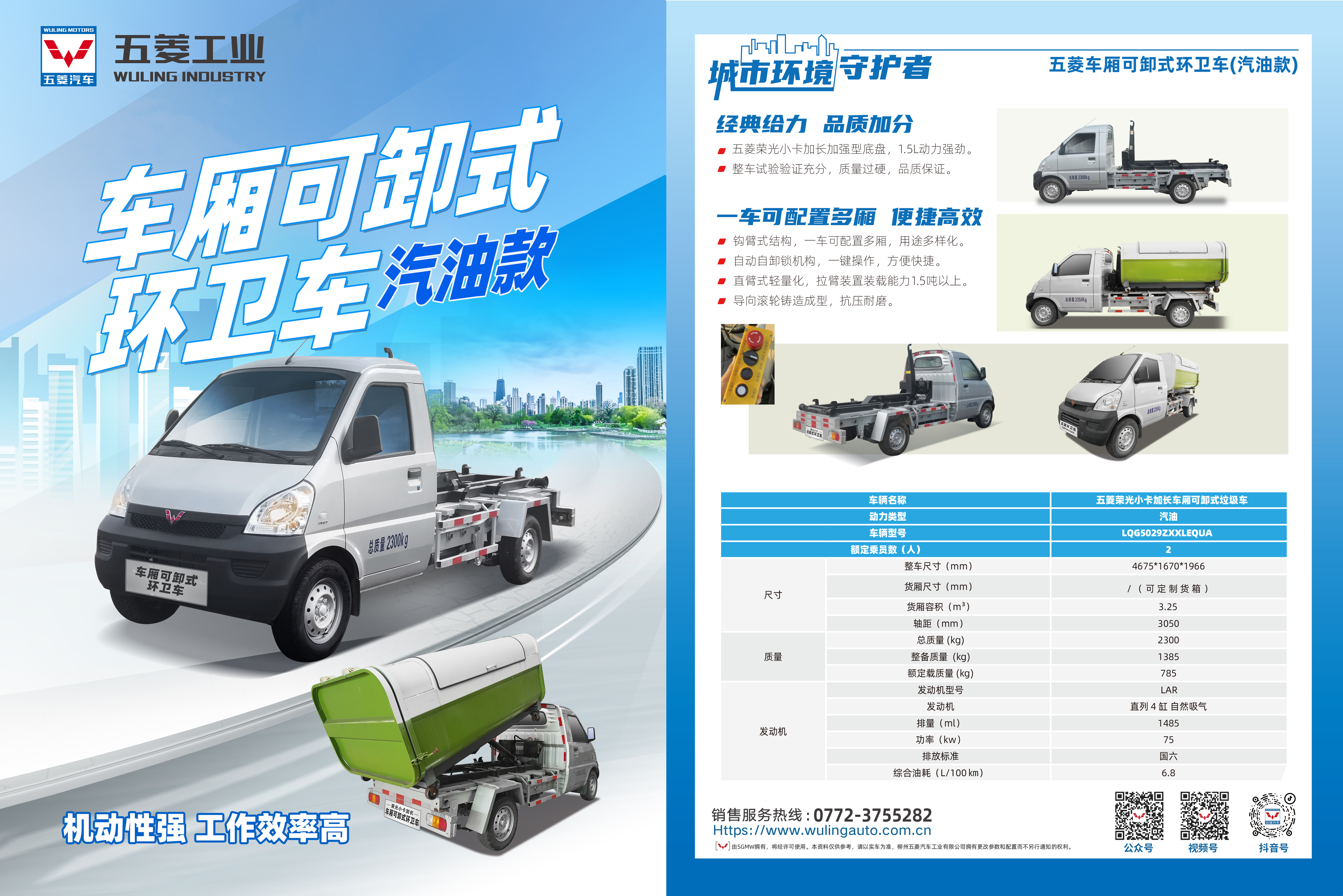 五菱荣光底盘基础上加装钩臂装置、液压电控系统等组成带卸箱、卸料功能的微型机动垃圾收运车辆。选用上海沃勒拉臂式自装卸装置,轻量化设计、结构强度高,性能稳定,可装载更多货物。配备可移动式操作手柄,现场作业灵活机动。卸料、卸箱两种功能,一键操作方便快捷;设置急停开关,人性化安全有保障。整车集收集、转运、自卸于一身,一车可配多个垃圾箱,小巧灵活,适用于乡村、城镇生活垃圾收集、转运。