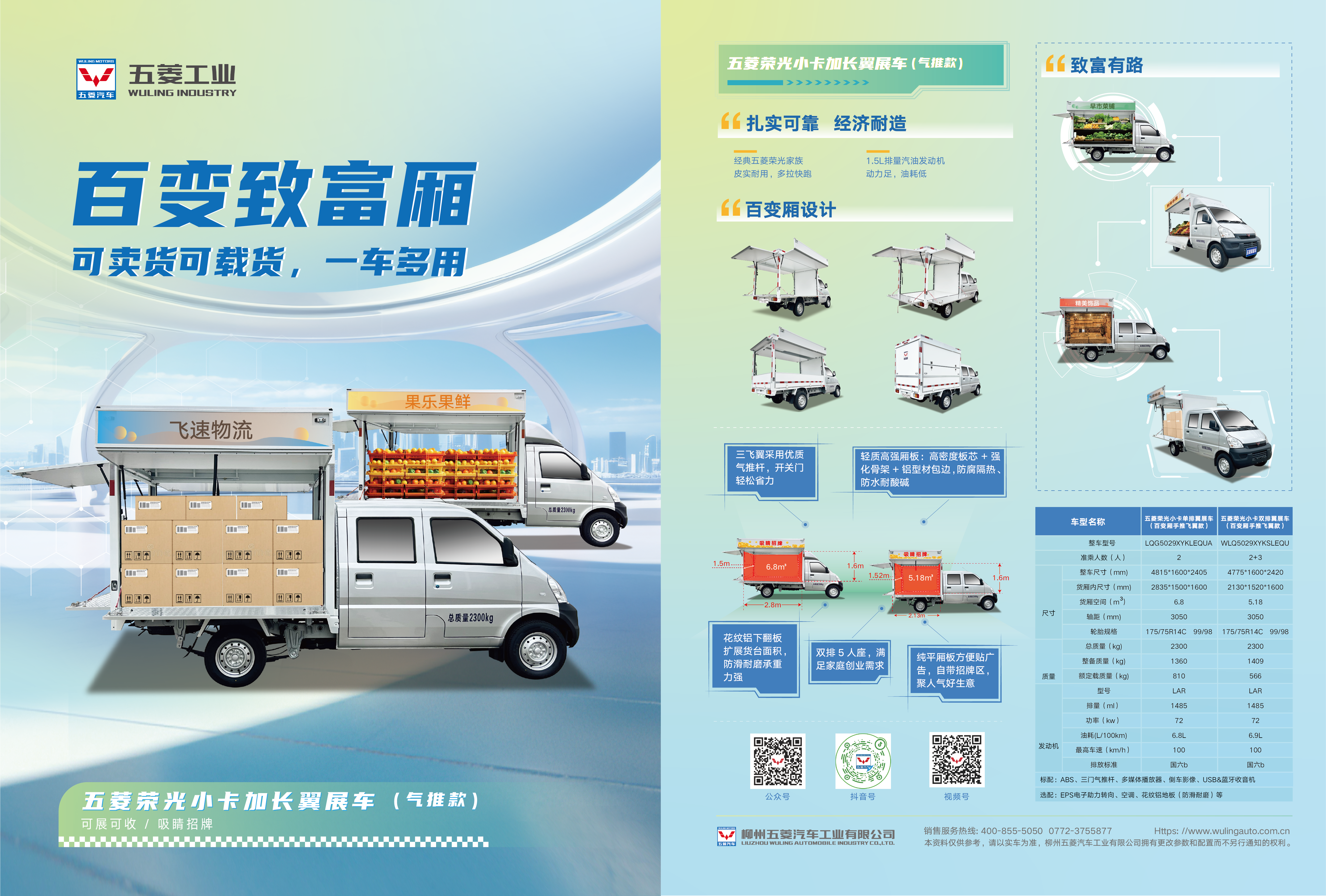 五菱荣光小卡加长翼展车,经典可靠,承载力与灵活性兼备,机动性强,占地面积小,宣传、配送、售卖、促销方式等多样灵活。